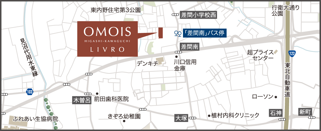 交通 JR武蔵野線・埼玉高速鉄道「東川口」駅まで徒歩34分 もしくは バス15分「差間南」バス停まで徒歩3分 自転車10分(実測)