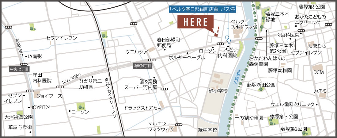 東武スカイツリーライン・東武アーバンパークライン「春日部」駅まで徒歩32分 もしくは バス15分「ベルク春日部緑町店前」バス停まで徒歩3分 自転車11分(実測)