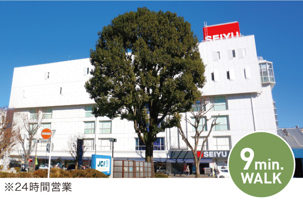 食料品、ファッション、家庭用品などを扱う西友を中心に、Seria、カーブスなどの専門店もある4階建の大型スーパーです。