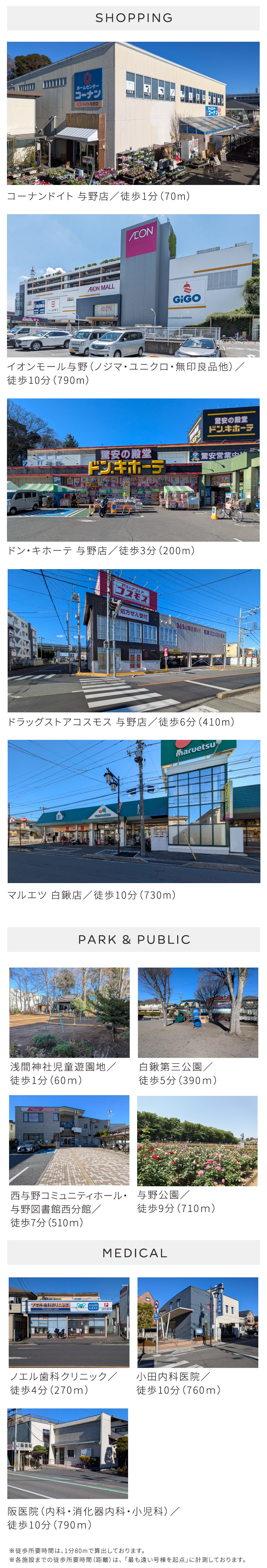 ■JR埼京線「与野本町」駅利用■「さいたま新都心」駅・「北与野」駅へバスや自転車でアクセス可能■比較的安定した地盤が広がる大宮台地の高台に位置■角地ならではの開放感と明るさの魅力があふれる街並み■立地の特性を住空間に活かした邸別設計■暮らし関連の施設が徒歩圏内に充実・与野西北小学校 徒歩8分・イオンモール与野 徒歩10分・セブンイレブンさいたま円阿弥2丁目店 徒歩3分