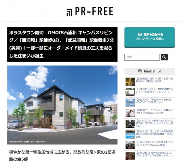 この度、ポラスタウン開発株式会社(本社:埼玉県さいたま市南区、代表取締役:中内晃次郎)は、新築一戸建分譲住宅『OMOIS西浦和 キャンバスリビング』(埼玉県さいたま市、全5邸)を販売することを、お知らせいたします。