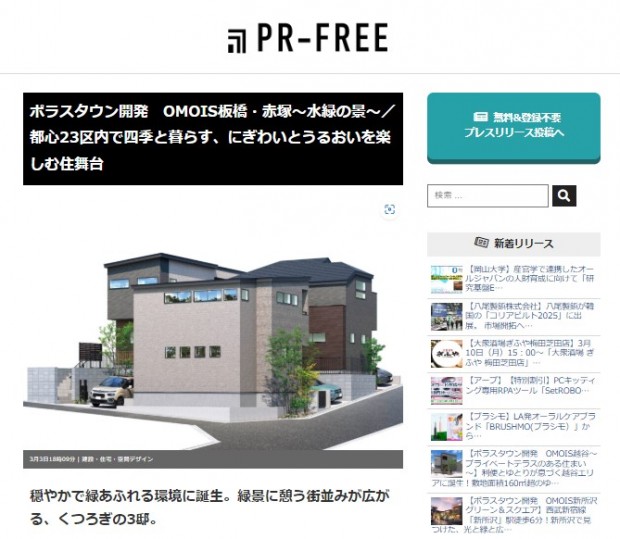 この度、ポラスタウン開発株式会社(本社:埼玉県さいたま市南区、代表取締役:中内晃次郎)は、新築一戸建分譲住宅『OMOIS板橋・赤塚~水緑の景~』(東京都板橋区、全3邸)を販売することを、お知らせいたします。