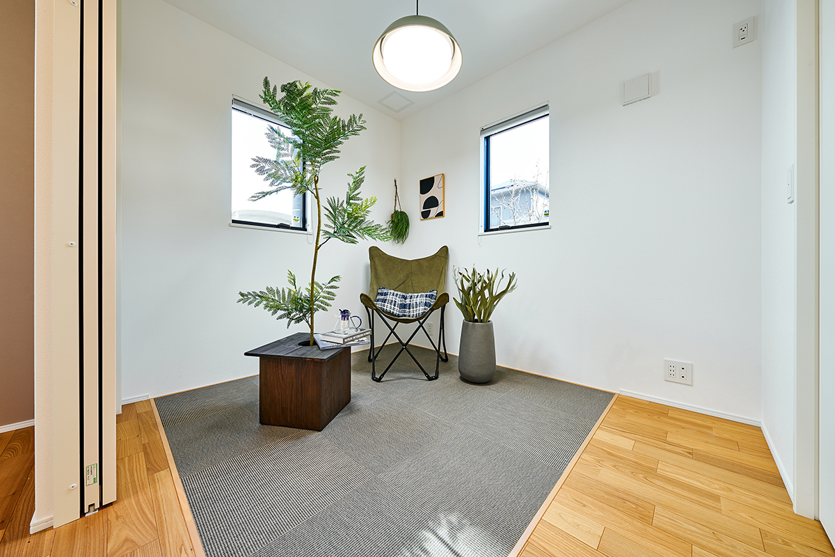 LDの一角にテキスタイルフロア敷きのスペースを設置。柔らかな質感で、ヨガや子どもの遊び場にもピッタリです。※モデルハウス1号棟(2025年11月撮影)