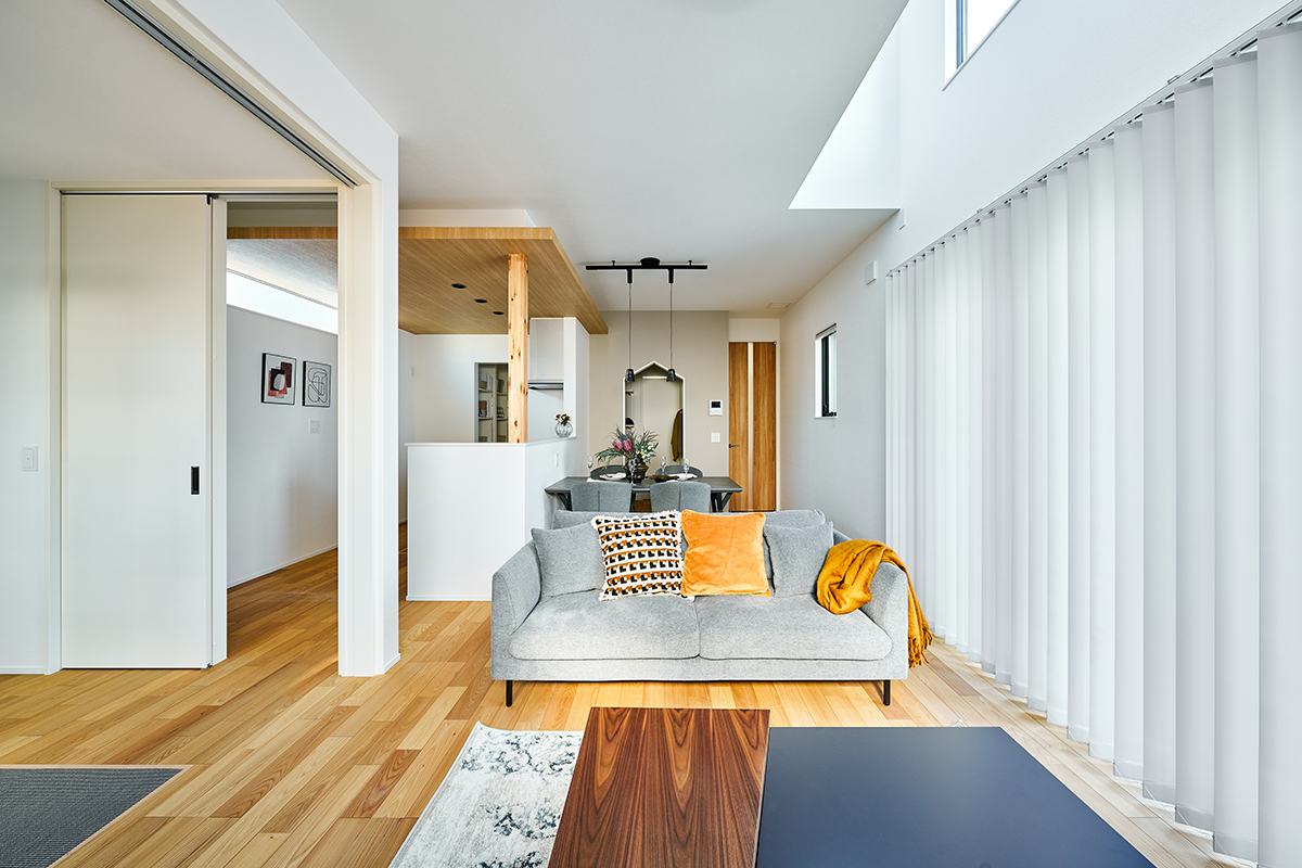 リビングの上部に吹抜けを設けました。特別な開放感を満喫できる空間で、家族がのびのびと暮らせます。※モデルハウス1号棟(2025年11月撮影)