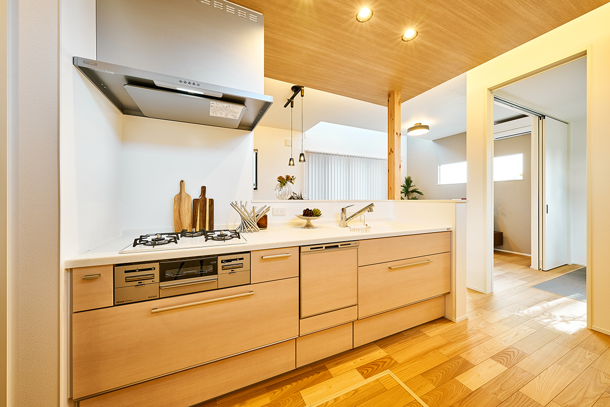 熱や汚れ、衝撃などに強く、美しさが長持ちする人造大理石ワークトップを用いたシンク一体型カウンターキッチン。※モデルハウス1号棟(2025年11月撮影)