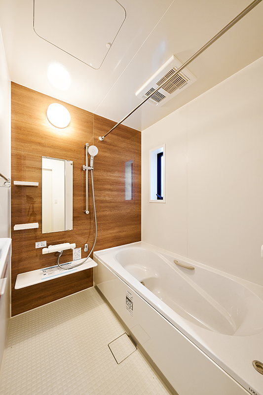なめらかな光沢が美しい人造大理石浴槽は、ダブル保温構造で地球にも家計にも優しいエコアイテム。いつでもきれいなバスルームが続く、お手入れの簡単さも魅力です。※モデルハウス1号棟(2025年11月撮影)