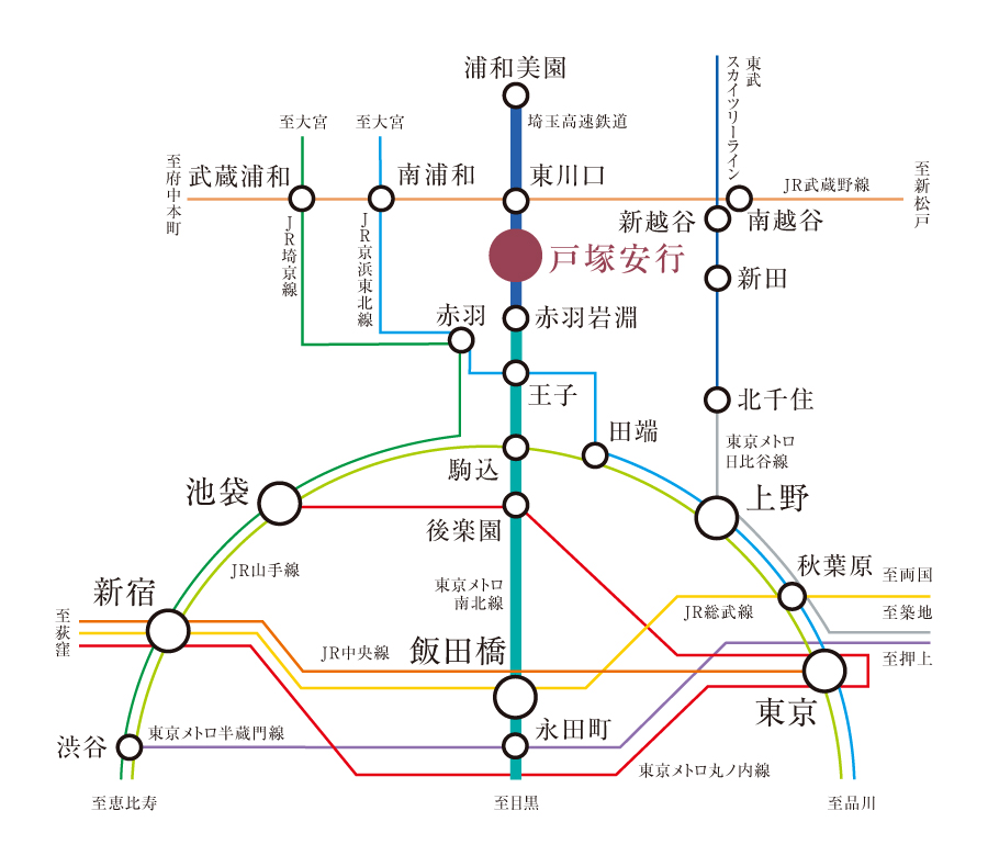 埼玉スタジアム線「戸塚安行」駅より、「大宮」駅へ28分、「池袋」駅へ31分、「飯田橋」駅へ直通34分で到着します。※電車の所要時間は通勤時間帯のもので、乗換・待ち時間を含みます。