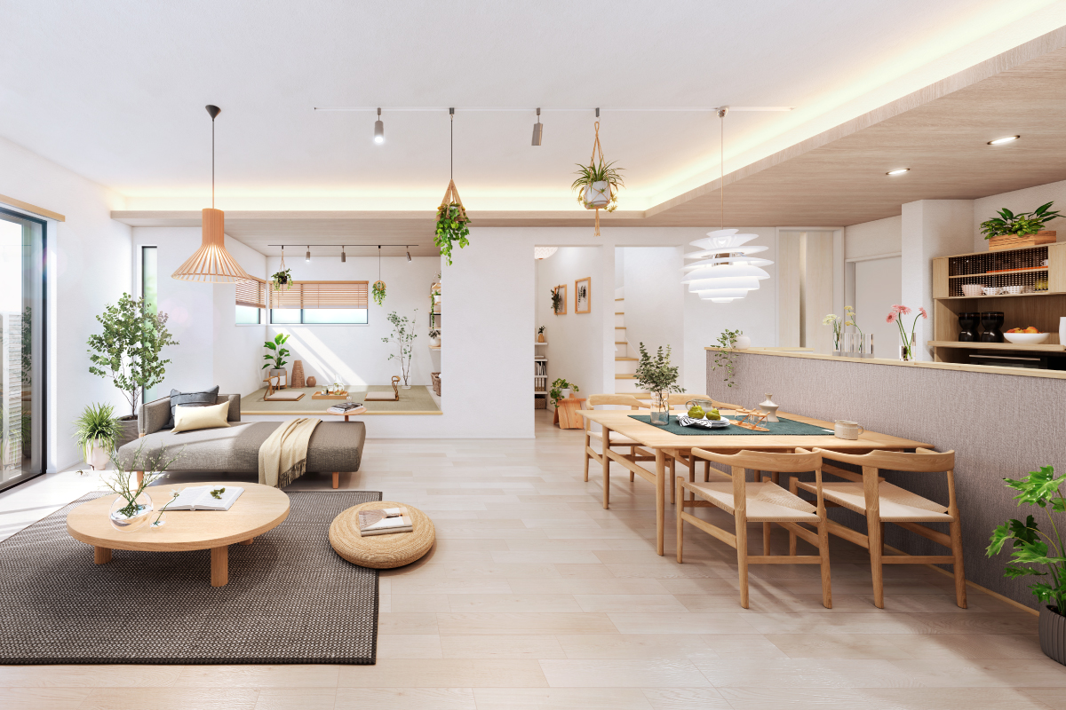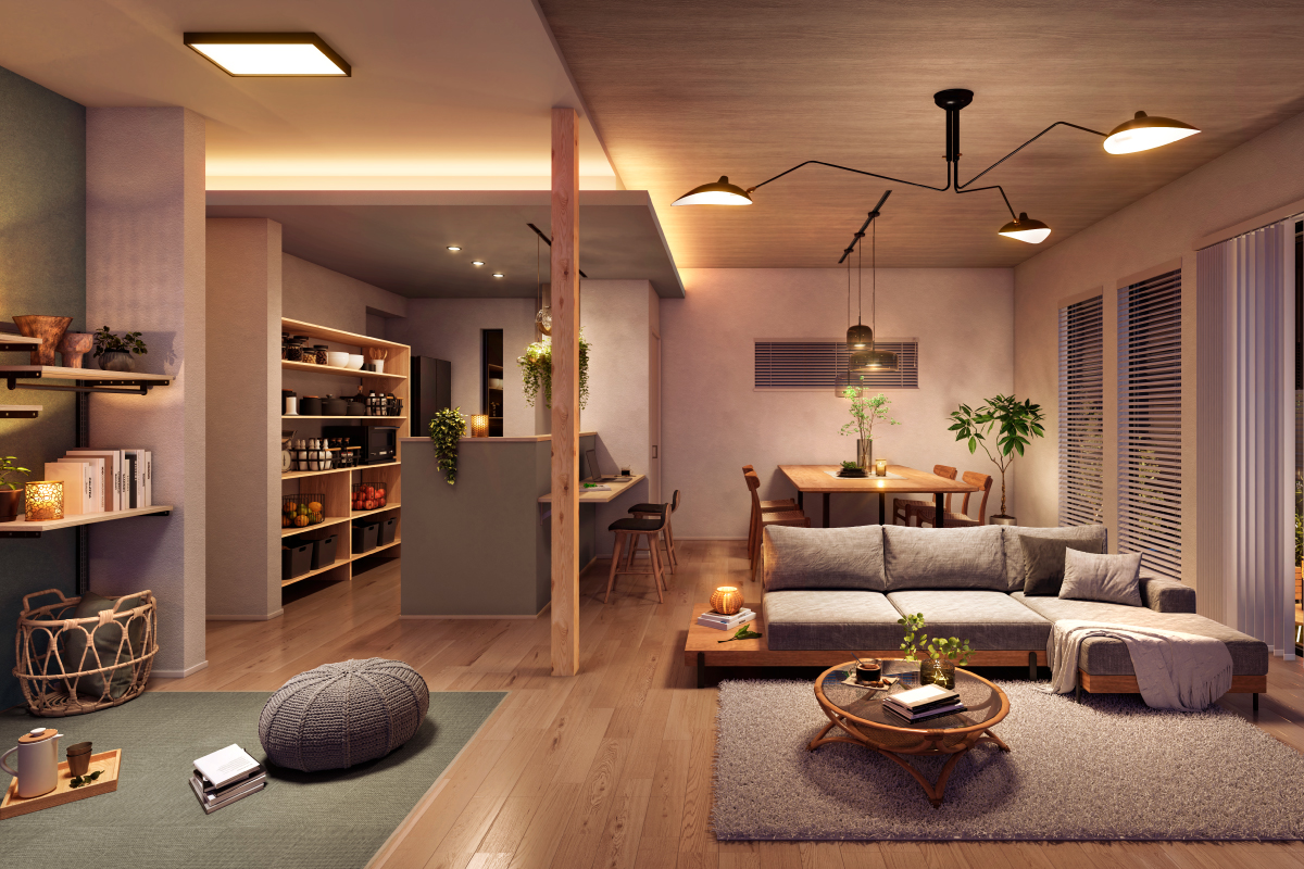 LDKは、20帖以上の広さにフラットマルチを設けた憩いの空間。みんなが集まり、思い思いの楽しみ方ができる場としました。※2号棟LDK完成予想図