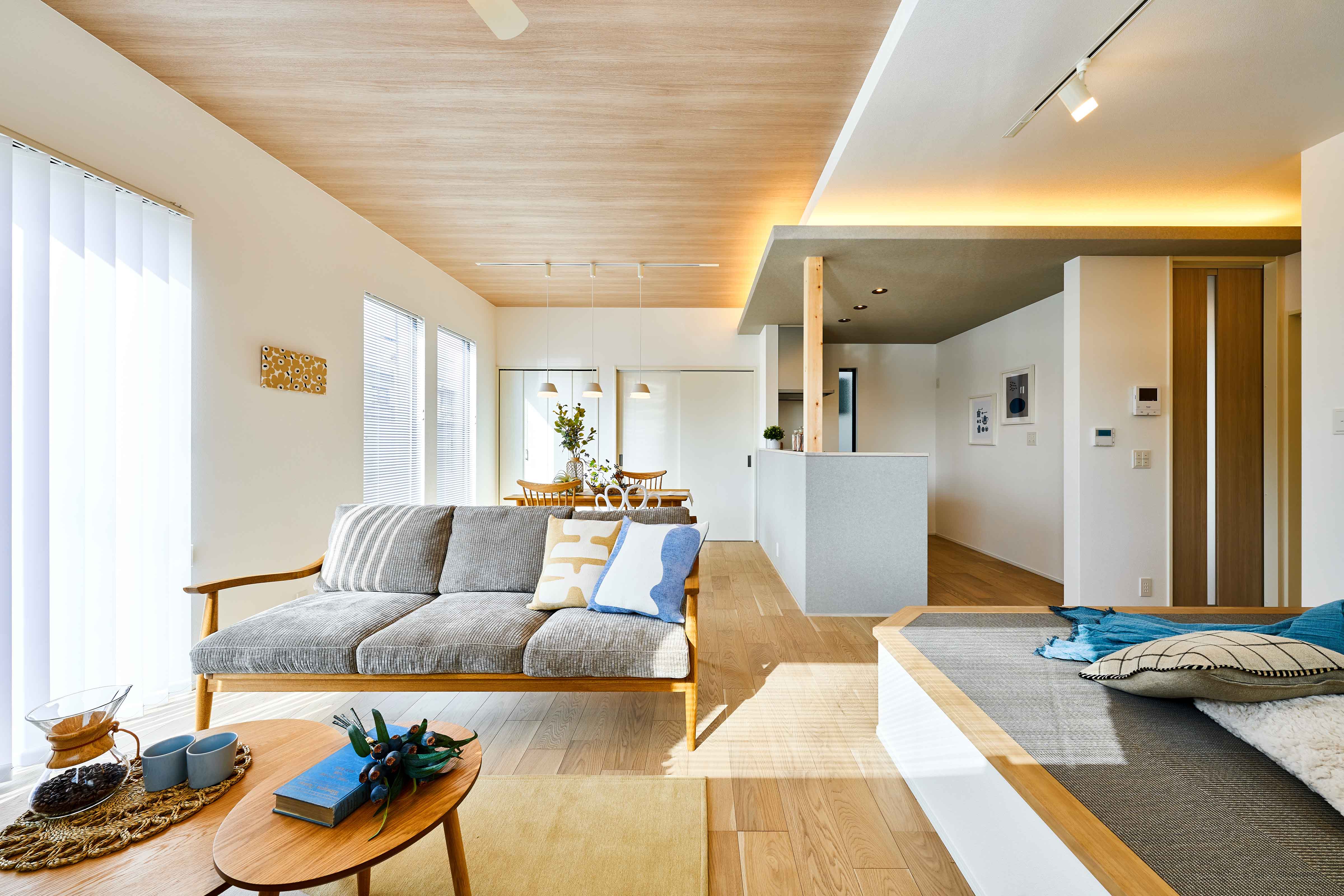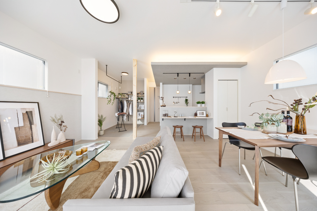 フラットマルチの空間を含め、家族のくつろぎ空間は20帖超の広さを確保しました。キッチンにはカフェカウンターを設け、憩いの時間を楽しめるLDKとしました。※モデルハウス1号棟(2026年2月撮影・分譲済)※掲載のモデルハウス1号棟は物件選択の一途として公開しているものであり、今回販売対象ではございません(分譲済)