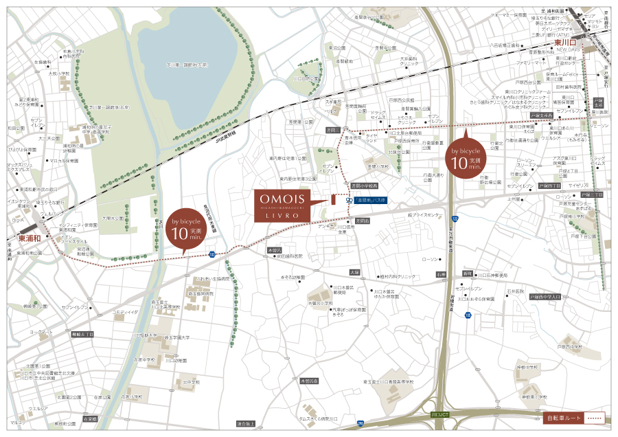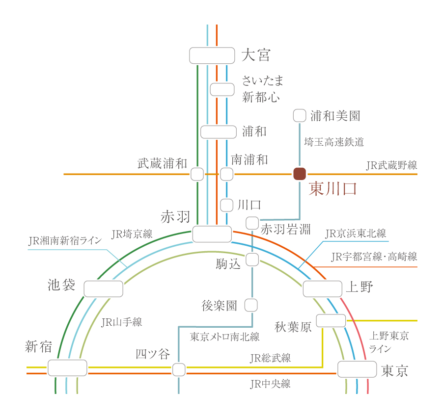 埼玉高速鉄道・JR武蔵野線「東川口」駅より、「大宮」駅へ19分、「池袋」駅へ33分で到着します。※電車の所要時間は朝のラッシュ時のもので、乗換・待ち時間を含みます。