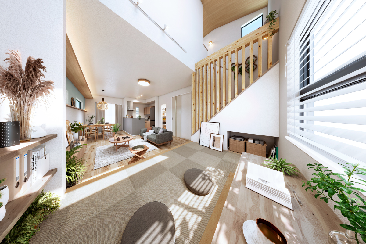 リビングとつながるマルチコーナーやオープンなキッチン、団らんを生む吹抜けなど、ふれあいが深まり語らいが弾む空間にこだわっています。※9号棟LDK完成予想図