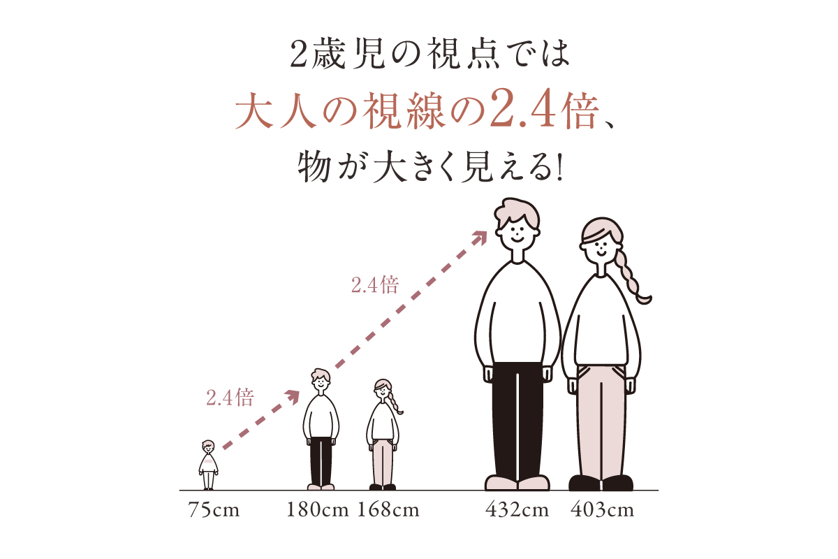 多くの住宅は、子どもでは使いにくい寸法になっています。そこでキッズスケールでプランを行い、自然に片付けや自由な遊びが誘発されるようにしました。※画像はイメージです。