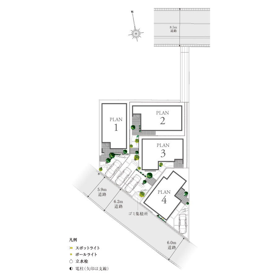 敷地面積100平米超のゆとりある全4邸。各邸には豊かな植栽や下草を配植し、四季の移ろいを身近に感じられる潤いの風景を演出します。