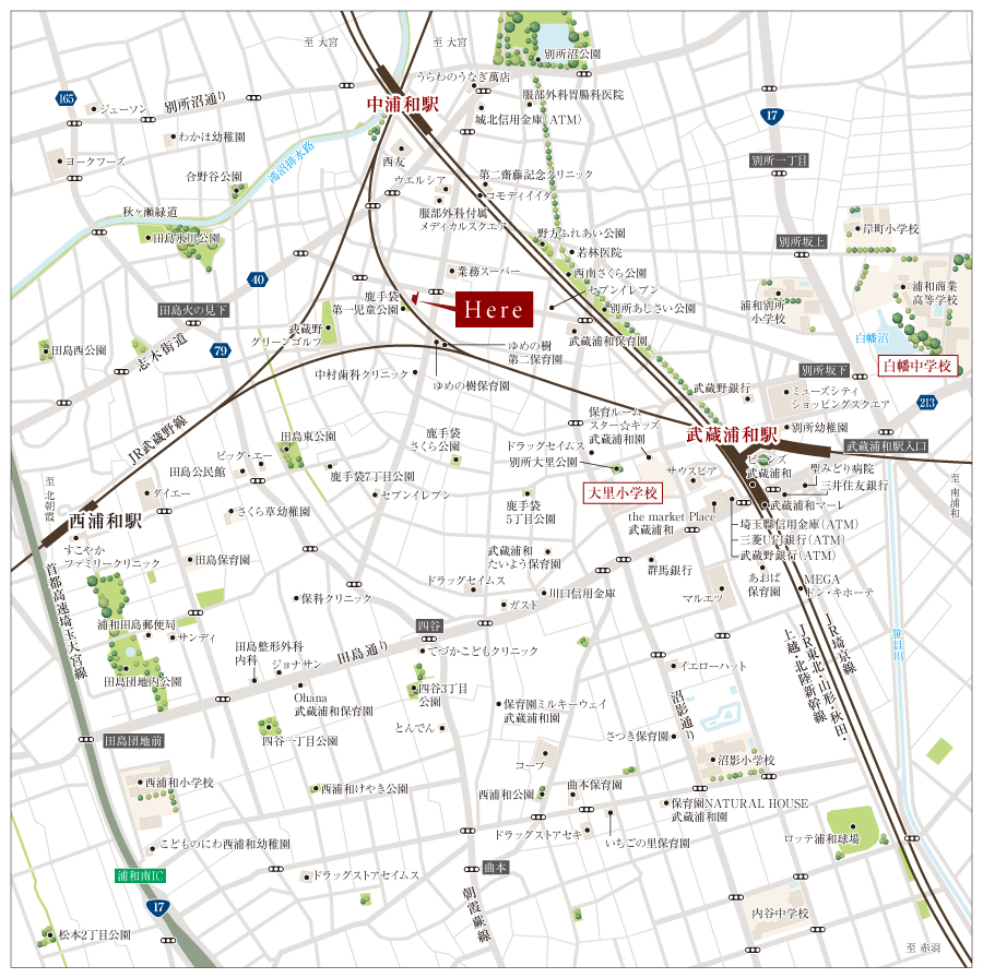 JR埼京線・JR武蔵野線「武蔵浦和」駅まで徒歩17分 JR埼京線「中浦和」駅まで徒歩9分 JR京浜東北線・JR東北本線・JR高崎線「浦和」駅まで徒歩38分 もしくは バス12分「関」バス停まで徒歩5分 JR武蔵野線「西浦和」駅まで徒歩18分 JR京浜東北線・JR武蔵野線「南浦和」駅まで徒歩45分 もしくは バス18分「沼影」バス停まで徒歩13分 |