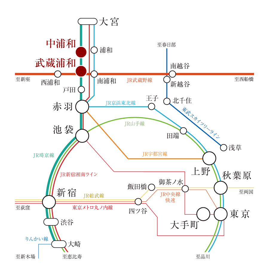 JR埼京線・武蔵野線「武蔵浦和」駅より、「大宮」駅へ直通7分、「池袋」駅へ直通18分で到着します。※電車の所要時間は朝のラッシュ時のもので、乗換・待ち時間を含みます。