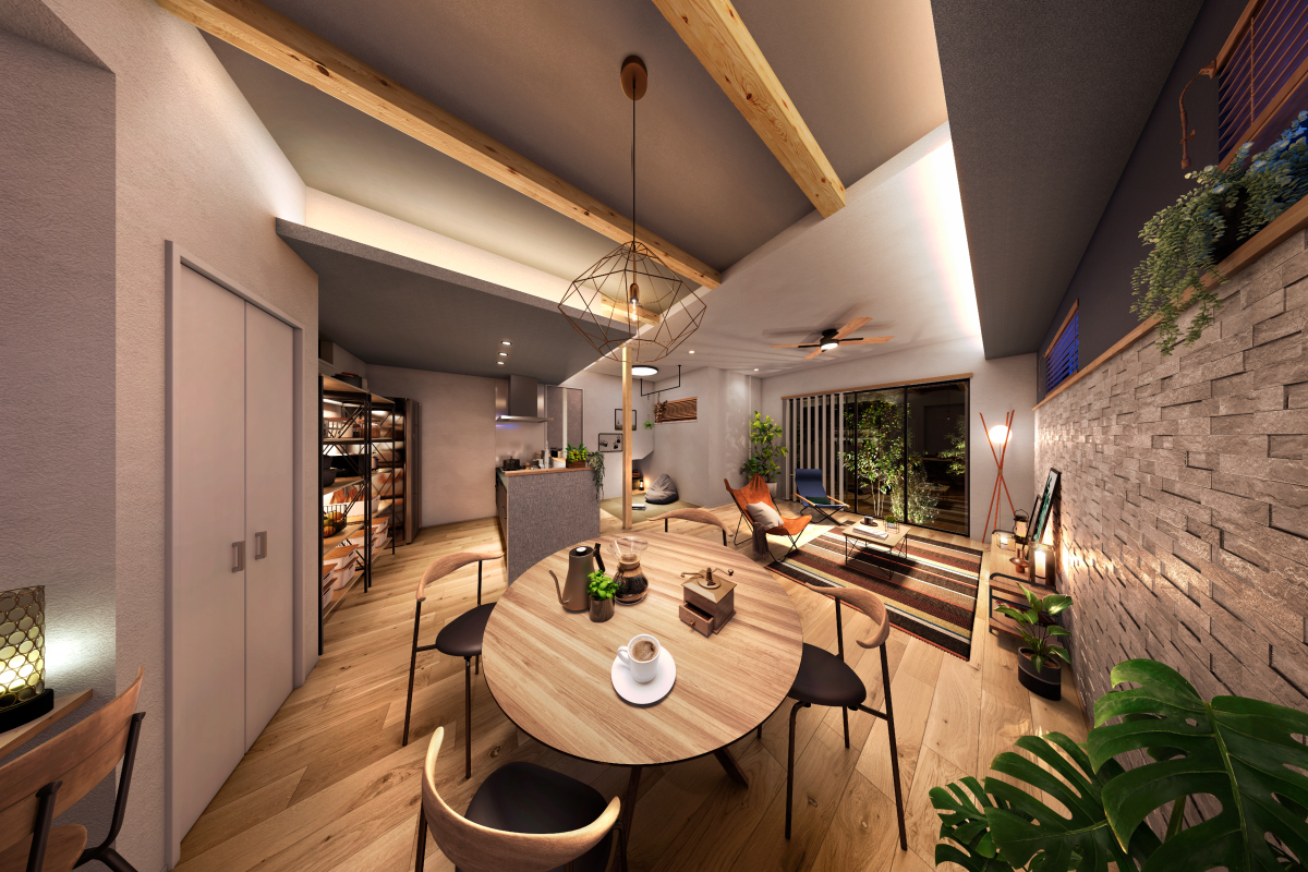 天井高を活かした吹抜設計が、空間に縦の伸びやかさと光の広がりを創出。自然光に包まれた明るいリビングが、家族の時間をより心地よく彩ります。※2号棟LDK完成予想図