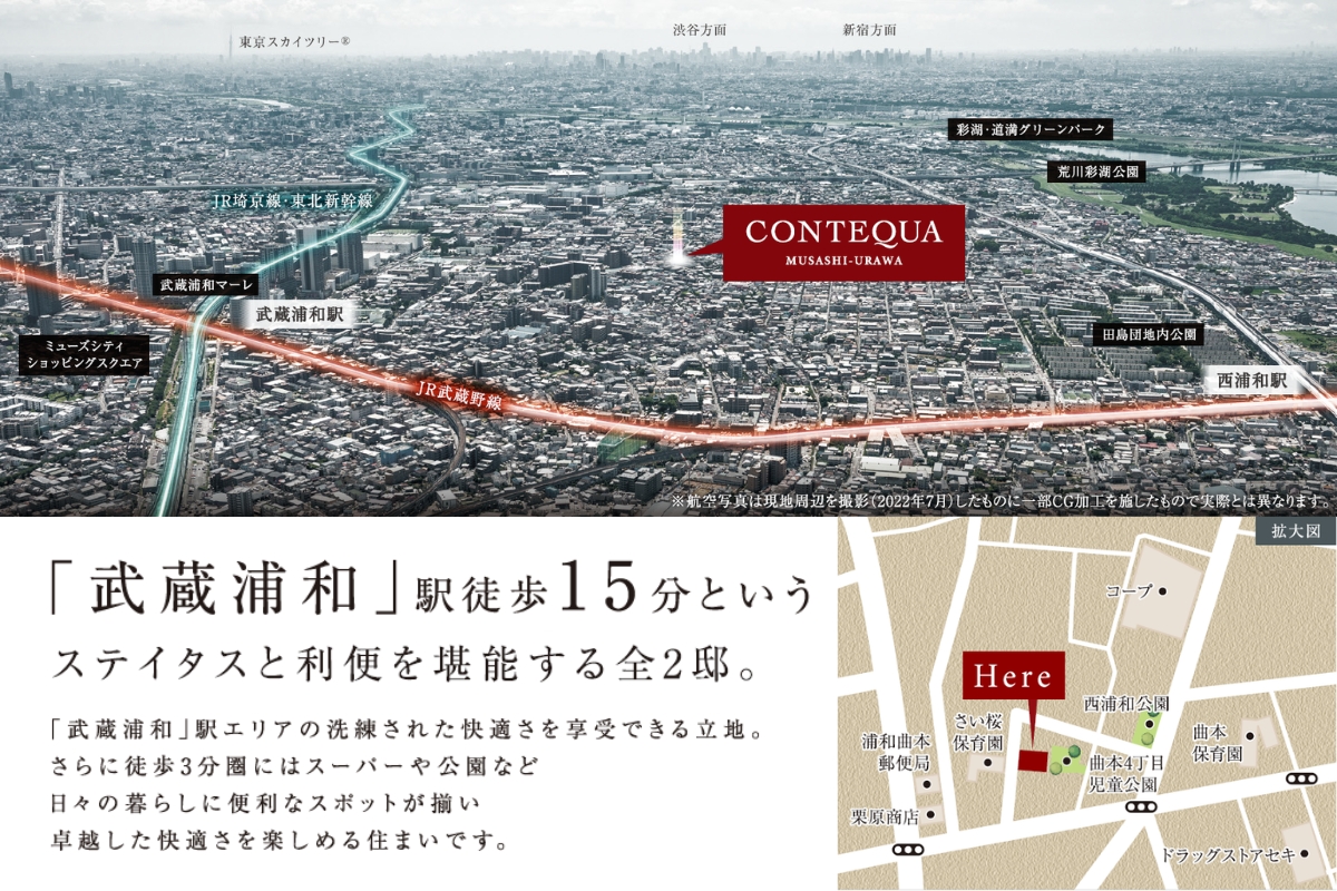 JR埼京線・武蔵野線「武蔵浦和」駅より、「池袋」駅へ直通18分、「新宿」駅へ直通23分でアクセスできます。※電車の所要時間は朝のラッシュ時のもので、乗換・待ち時間を含みます。